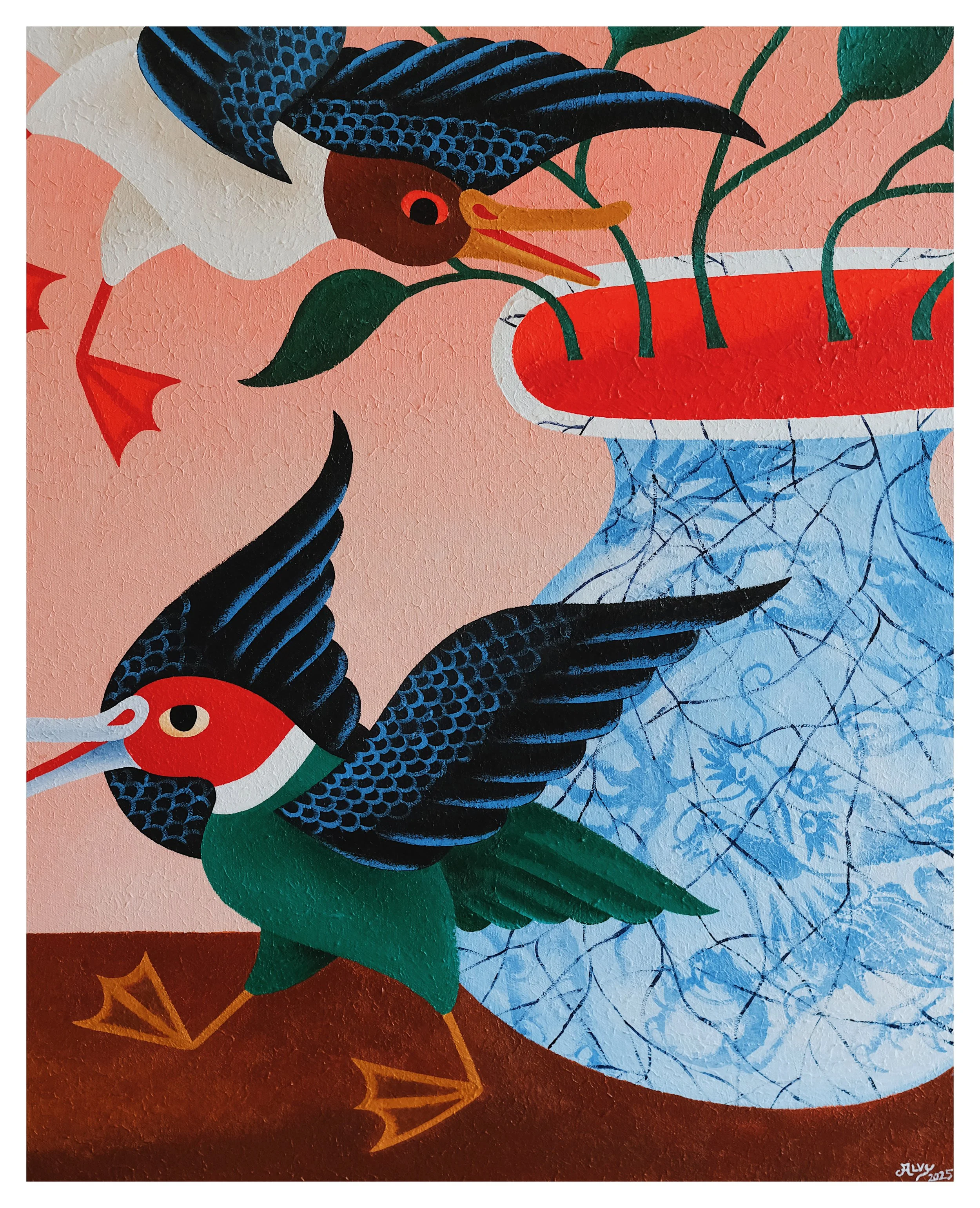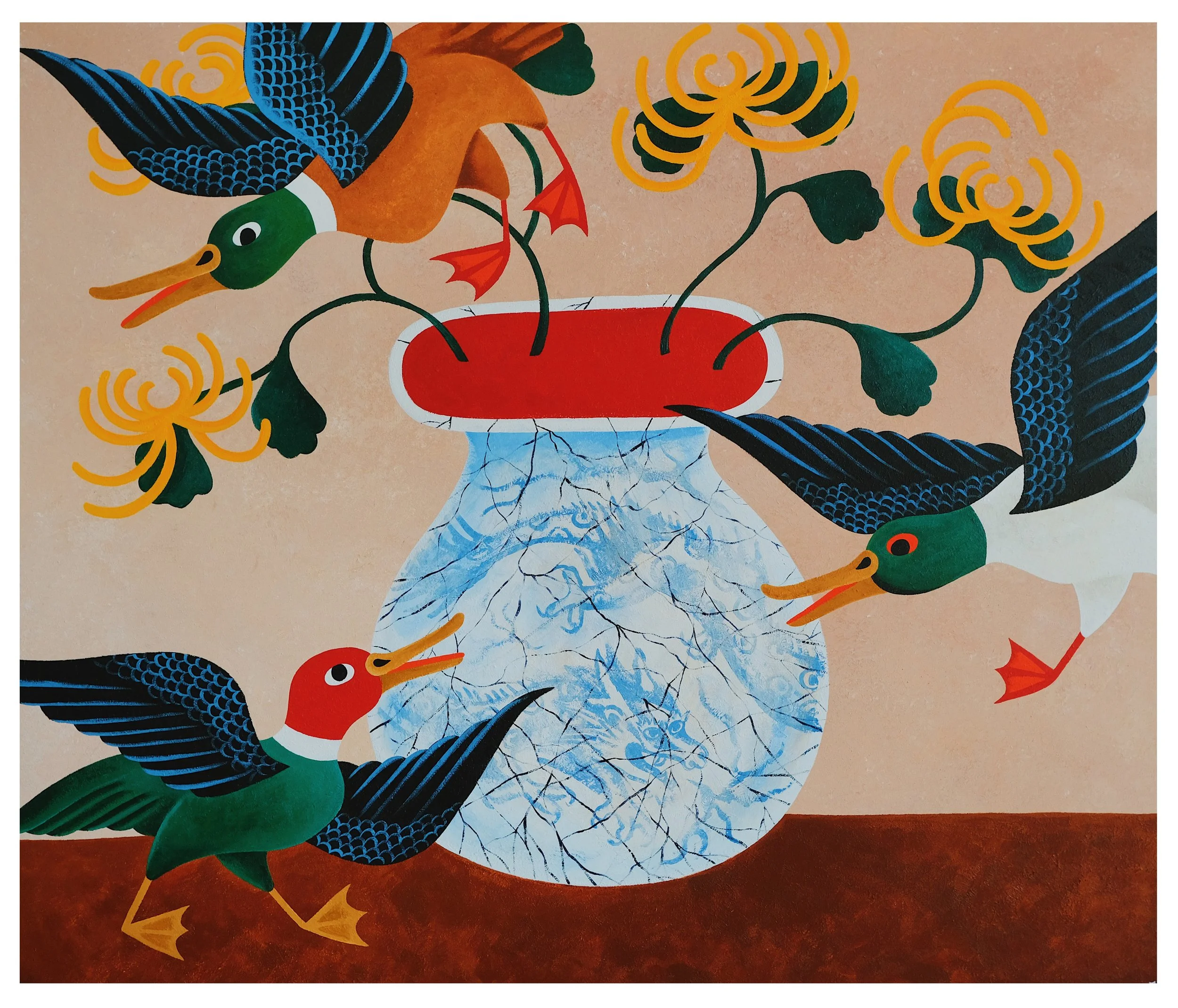 2025 Ducks and a dragon vase of golden crysanthemums.jpg